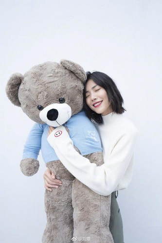 刘雯怀抱大熊玩偶道晚安 闭眼微笑很甜美