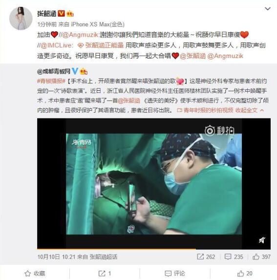 随后,张韶涵本人转发这条微博并说道:“加油”。网友们也纷纷表示:“谢谢你让我们知道音乐的大能量,祝你早日康复”。