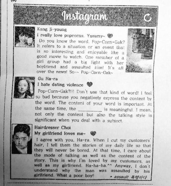 韩国某女子高中在英文试卷中以具荷拉事件出题据媒体报道,韩国某女子高中近日被爆料在英文试卷中以具荷拉与男友的新闻作为题材出题而引发了争议。这份考题昨天在网上曝光,考题中具荷拉与前男友崔某以及Kara原成