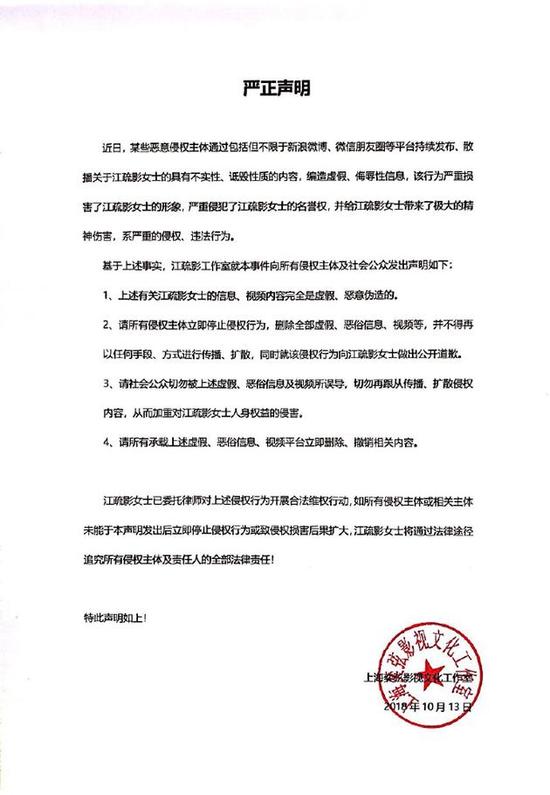 江疏影工作室就不实信息声明:依法维权 绝不姑息