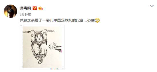 13日晚,潘粤明晒出一张速写图,并配文字“休息之余看了一会儿中国足球队的比赛…心塞”。