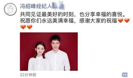 冯绍峰经纪人随后也在朋友圈发文送祝福。他说:“共同见证最美好的时刻,也分享幸福的喜悦。祝愿你们永远美满幸福,感谢大家的祝福”