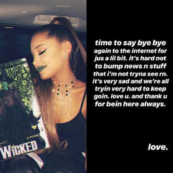 文中称,“今天是很独特的一天,很感激我能到场,是时候对互联网说短暂的再见了。很难不去看到那些消息,这很让人伤心,我也在努力克服,我爱你们,很感谢你们一直都在。”