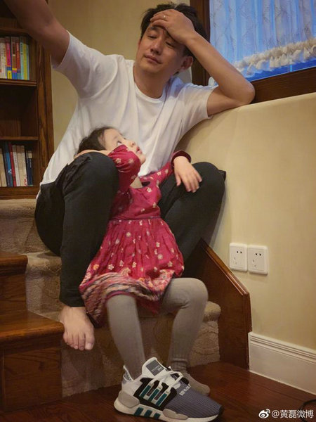 10月17日,黄磊在微博晒出与小女儿的温馨合影,照片中父女俩坐在台阶上,黄磊扶额看向远方,妹妹人儿则仰头看着爸爸。不知是否因为角度问题,妹妹人儿仿佛穿着黄磊的鞋,小小的脚在大大的鞋子里,画面十分逗趣,