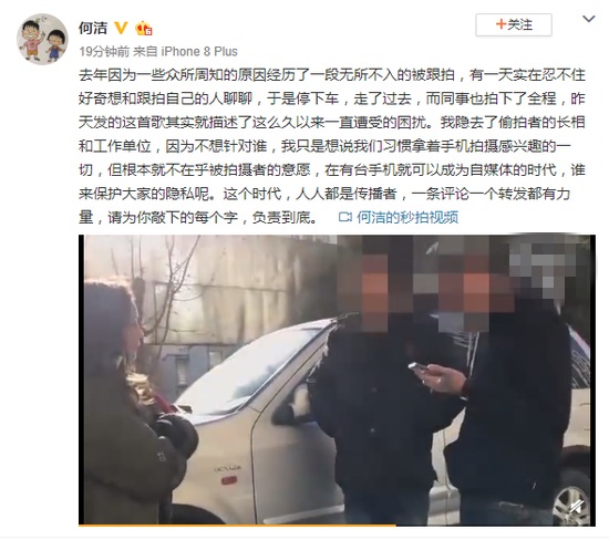 10月17日,何洁在自己微博上传一段视频,视频中展示了她与跟拍者的对话。她配文称:“去年因为一些众所周知的原因经历了一段无所不入的被跟拍,有一天实在忍不住好奇想和跟拍自己的人聊聊,于是停下车,走了过去,而同事也拍下了全程,昨天发的这首歌其实就描述了这么久以来一直遭受的困扰。我隐去了偷拍者的长相和工作单位,因为不想针对谁,我只是想说我们习惯拿着手机拍摄感兴趣的一切,但根本就不在乎被拍摄者的意愿,在有台手机就可以成为自媒体的时代,谁来保护大家的隐私呢。这个时代,人人都是传播者,一条评论一个转发都有力量,请为你敲下的每个字,负责到底。”