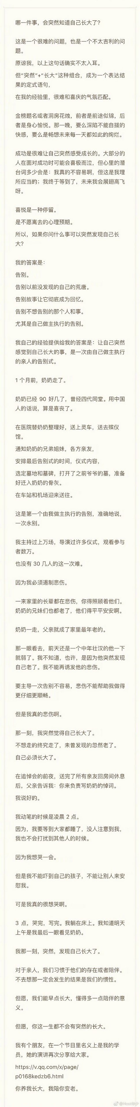 微博末文还称:“但愿,我们能早点长大,懂得多一点陪伴的意义。但愿,你这一生都不会有突然的长大!”网友看到此情深微博后纷纷留言安慰称:“生老病死无可避免,收拾心情待装出发。”“人的尽头,突然长大。最坚强的人,往往有着伤痕累累的过往。只有经历,才能治愈。”“害怕的是突然长大,一夜之间变成了大人。”