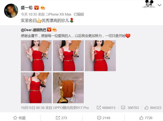 盛一伦力挺迪丽热巴获金鹰奖:实至名归