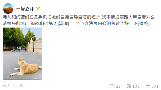 他写道:“嫣儿和闺蜜们在拿手机拍她们自编自导自演的短片,我申请扮演路人甲牵着八公从镜头前滑过,被她们拒绝了。一个下岗演员内心的苦请了解一下。”此外,李亚鹏还晒出了一张图。