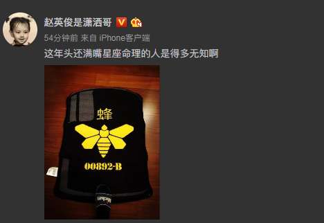 赵英俊日前在自己微博晒出一张照片,并配文称:“这年头还满嘴星座命理的人是得多无知啊。”疑似回应与袁姗姗恋情绯闻。