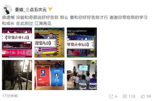 10月22日,《奇葩说》选手董婧在自己微博晒出一组照片,并配文称:“很遗憾,没能和奇葩说好好告别,那么要和你好好告别才行!谢谢你带给我的学习和成长,在此别过,江湖再见!”她晒出自己在《奇葩说》节目中的幕后工作,表示了对该节目的不舍。