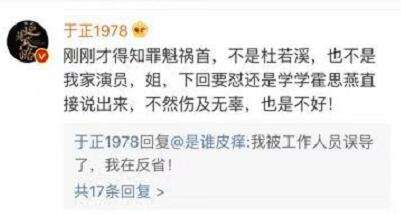 晚间,于正又回复称:“刚刚得知罪魁祸首,不是杜若溪,也不是我家演员。”还称自己是被工作人员误导了,在反省。