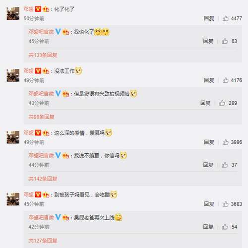 此视频曝光后,邓超也和网友互动并直呼“化了化了!”幸福的“吐槽”“没法工作!”最后还得瑟的称:“这么深的感情,羡慕吗?”逗比属性不改。