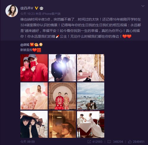 唐嫣罗晋在10月28日上午9点09分正式宣布结婚的喜讯,此前一直有传二人婚礼将在维也纳举办,更有罗晋发小的女友晒出疑似婚礼举办地点的图片。今天,唐嫣同寝室同学徐百卉发文为唐嫣送上暖心祝福:“维也纳时间半夜3点,突然睡不着了…时间过的太快!还记得16年前刚开学时在324寝室跟你认识的情景!记得每年你的生日我的生日我们的相互祝福:永远都是“越来越好,幸福平安!如今看你找到一生的幸福,真的为你开心!真心祝福你!你永远是我们的糖公主!无论什么时候我们都在你的身边!”