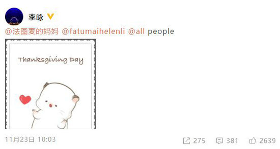 李咏生前最后一条微博 感恩节感谢妻女及所有人