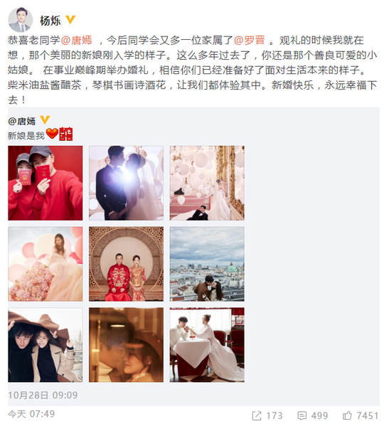 杨烁发文祝福老同学唐嫣:新婚快乐 永远幸福下去