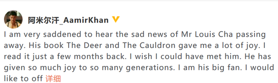 印度著名影星阿米尔汗也在微博上悼念金庸,并表示自己是他的忠实粉丝,得知他去世的消息非常难过。