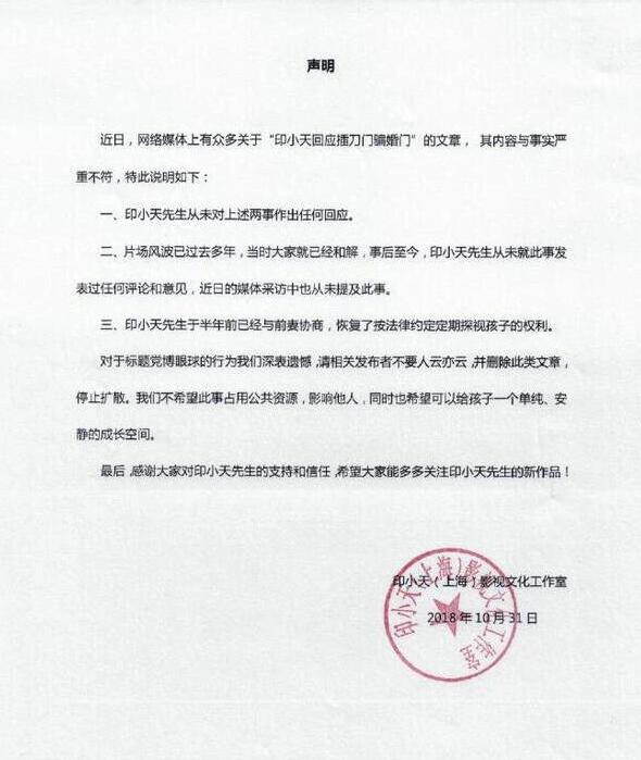 10月31日,印小天工作室针对“印小天回应插刀门骗婚门”发布声明,称印小天从未对上述两事作出回应,随后印小天本人也转了工作室的否认微博。