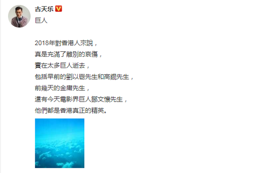 4日早,古天乐发文感慨香港太多巨人逝去。全文:巨人2018年对香港人来说,真是充满了离别的哀伤,实在太多巨人逝去,包括早前的刘以鬯先生和高锟先生,前几天的金庸先生,还有今天电影界巨人邹文怀先生,他们都