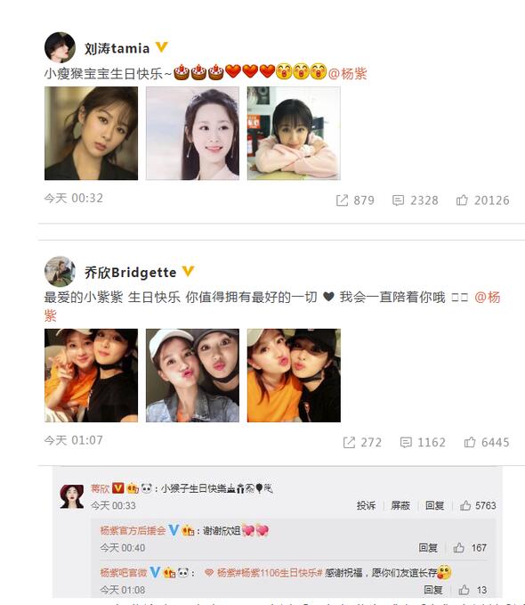 杨紫迎26岁生日 刘涛蒋欣乔欣送祝福未见王子文
