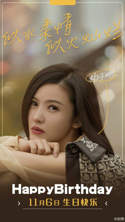 “@杨子姗 生日快乐宝贝!你的天赋让我震惊也让我成功!感谢我们多年互相陪伴,你真的让我倾佩尊重。因为纯洁是演员第一要素,你真的太美了………!拥有幸福,感激懂你的每一个人!”