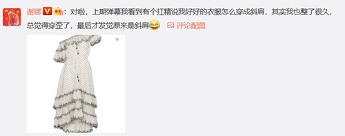 这条弹幕恰好被开着弹幕看节目的谢娜看到了,并且影响了她的心情。谢娜对这条弹幕很不满,同时担心粉丝也误会自己,于是就专门说了说这件事。她解释,“这条裙子本来就是斜肩的,并不是自己故意扯下来的”。同时她还想怼一下杠精,结果不料,她把“杠”不小心打成“扛”。