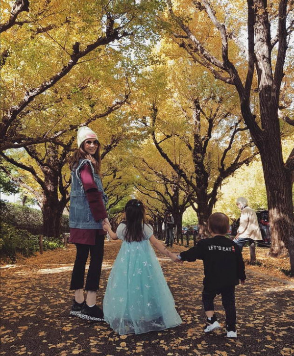 11月7日,昆凌在社交网站晒出一张自己手牵一儿一女漫步在秋日街头的照片,图中三人所在的街道两侧是两行银杏树,黄色的树叶掉落满地,使整个场景唯美浪漫。