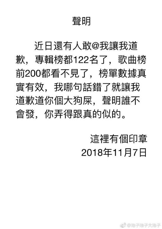 今天,脱口秀演员池子发“声明”喊话吴亦凡粉丝:“专辑榜都122名了,歌曲榜前200都看不见了,榜单数据真实有效,我哪句话错了就让我道歉?”