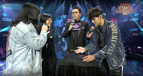 变魔术之前,周杰伦特别cue镜头拉近,还要求:“请说出’周杰伦我爱你’。”粉丝也听话地当场大喊出来。周董手扶着眼镜,立刻说:“好,来啰!请仔细地看一下。”接着手一转,就见眼镜翻了一圈。他接着又跟另一位女观众借眼镜,并要对方说“李健我爱你”,却没让眼镜顺利翻过去。