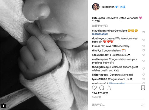 超模Kate Upton今日在社交网站上晒出婴儿照片,宣布自己已经于美国当地时间11月7日生下爱女,取名为Genevieve Upton Verlander。据悉,Kate Upton与“虎王”Justin Verlander交往6年,2017年11月在意大利结婚,今年7月,她在社交网站上晒出孕肚照,宣布怀孕。