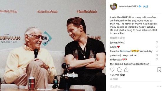现任电影“蜘蛛侠”汤姆·霍兰德悼念斯坦·李:“我们有那么多人都从他身上获益,而没有人比我由他获益更多了。漫威之父给了很多人快乐。这是多么好的人生和成就啊。安息吧,斯坦。”