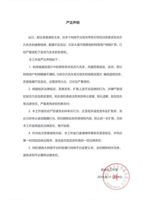 11月13日,吴亦凡工作室就网传视频发表声明,称今日有部分网友在多个网络平台,发布带有引导性且恶意诋毁吴亦凡先生的虚假信息,引发大量不明真相的网络用户相继扩散,严重侵犯了吴亦凡先生的名誉权,表示网传的动图/视频/图片中的男性并非吴亦凡本人,系恶意造谣诽谤,并表示已启动法律程序,将对造谣者追究相关法律责任。