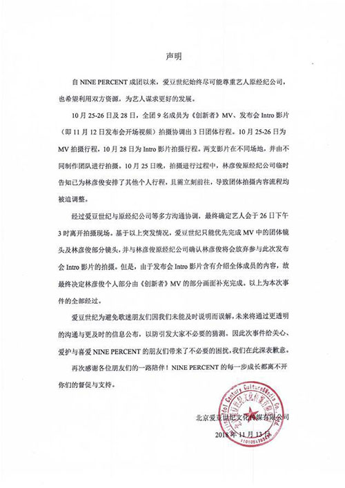 11月13日,Ninepercent针对粉丝控诉的镜头资源分配不均的问题发表声明,称:“10月25-26日为团体MV拍摄行程,10月28日为影片拍摄行程。25日晚,拍摄进行过程中,林彦俊原经纪公司临时告知已为林彦俊安排了其他个人形成,且需立刻前往,导致团体拍摄内容流程均被迫调整。”并表示经过多方沟通后,只能优先完成MV中的团体镜头,以及林彦俊的部分镜头,并与林彦俊原经纪公司确认,林彦俊将会放弃参与此次发布会影片的拍摄。