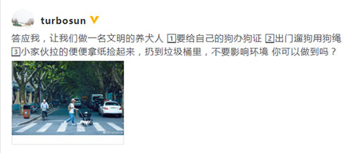 16日,孙俪在网上发文,号召大众做“文明的养犬人”。孙俪写道:“答应我,让我们做一名文明的养犬人:要给自己的狗办狗证;出门遛狗用狗绳;小家伙拉的便便拿纸捡起来,扔到