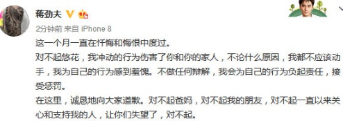 蒋劲夫承认家暴:让你们失望了,对不起
