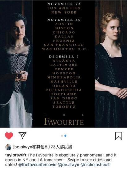 霉霉上线为男友宣传新电影11月23日,霉霉在社交媒体上更新一段小视频为男友乔-阿尔文宣传新电影。配文:“最棒的事情就要来了,在纽约和洛杉矶都有场次,赶紧选择时间去看吧”,并在后