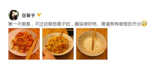 23日,张馨予在自己微博上传一组照片,分享婚后与丈夫的趣事。她调侃道:“第一次做面,不过还挺给面子的,据说很好吃,难道我有做饭的天分?”照片中,是她亲手做的面条,看起来令人食指