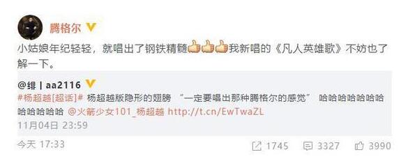 11月26日,有网友在微博晒出一段杨超越版《隐形的翅膀》,调侃称“一定要唱出那种腾格尔的感觉。”随后,腾格尔本人竟然转发了该微博,并大赞杨超越:“小姑娘年纪轻轻,就唱出了钢铁精髓。”