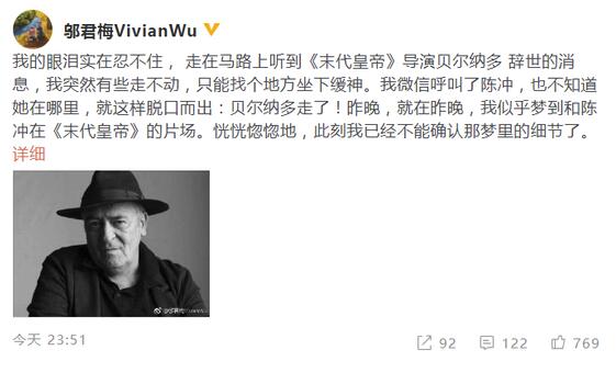 全文:我的眼泪实在忍不住, 走在马路上听到《末代皇帝》导演贝尔纳多 辞世的消息,我突然有些走不动,只能找个地方坐下缓神。我微信呼叫了陈冲,也不知道她在哪里,就这样脱口而出:贝尔纳多走了!昨晚,就在昨晚,我似乎梦到和陈冲在《末代皇帝》的片场。恍恍惚惚地,此刻我已经不能确认那梦里的细节了。