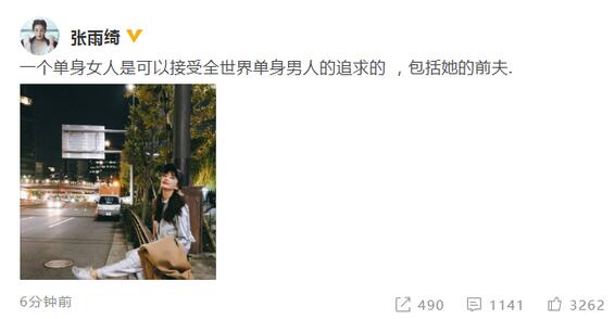 11月27日,张雨绮在网上发文,回应与前夫袁巴元的绯闻:“一个单身女人是可以接受全世界单身男人的追求的 ,包括她的前夫。”