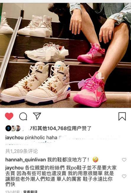 11月27日,周杰伦在社交网站晒出一张与好几双不同款式球鞋的合照。图中周杰伦坐在台阶上,身旁放着好几双球鞋,自己脚上穿着一双粉色的鞋子。周杰伦娇妻昆凌随后在社交网络与他互动留言“埋怨&rd
