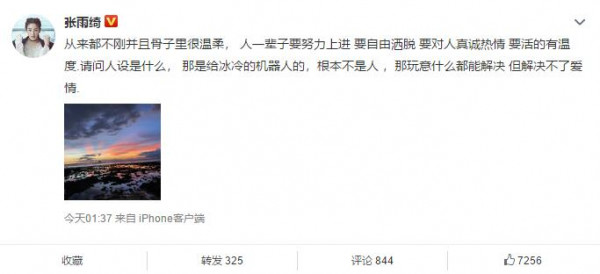 11月30日凌晨,张雨绮发文回应“人设”一说:从来都不刚并且骨子里很温柔,人一辈子要努力上进,要自由洒脱,要对人真诚热情,要活的有温度。请问人设是什么,那是给冰冷的机器人的,根本不是人,那玩意什么都能解决,但解决不了爱情。