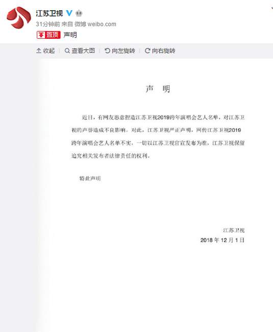 12月1日,江苏卫视官博发布声明,否认网传跨年活动艺人名单,辟谣并保留追究法律责任的权利。