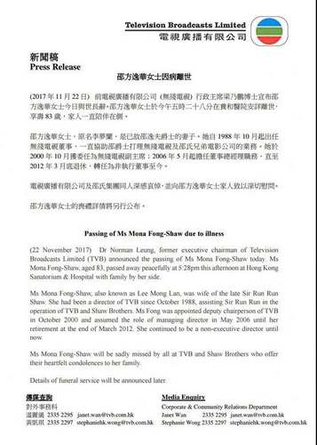 据TVB新闻报道指电视广播有限公司董事方逸华因病安祥离世,享年83岁。