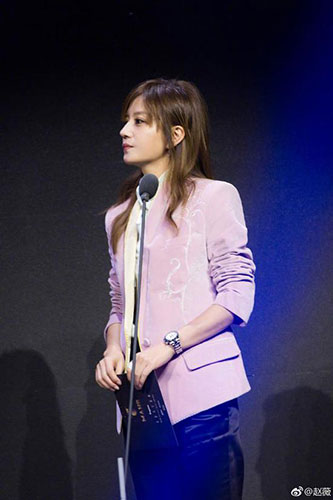 12月4日晚,赵薇通过微博晒美照,并写道:“哪儿来的主持人?”照片中,赵薇画着精致的淡妆,白色衬衫粉色小外套,配上黑色长裤,站在台上对着麦正在念着台词,尽显好身材,透露出成熟的