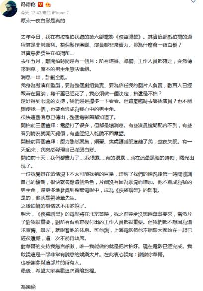 8月7日,冯德伦发表长微博,讲述《侠盗联盟》幕后故事,袒露拍摄《侠盗联盟》时的种种不易。他自曝在某天起床后发现自己竟一夜白了头。随后,舒淇转发安慰:“辛苦了。”