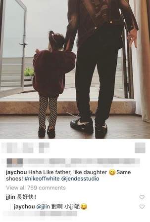 画面中,周杰伦与小周周背对着镜头,站在阳台的门前,他一手牵着女儿,一手对着镜头比YA。而绑马尾的小周周站在爸爸身边,年仅3岁的她身高已经直逼173公分爸爸的腰部。有趣的是父女俩脚上是穿着一模一样的运动鞋,周杰伦开心地在发文中炫耀:“有其父必有其女,一样的鞋子!”
