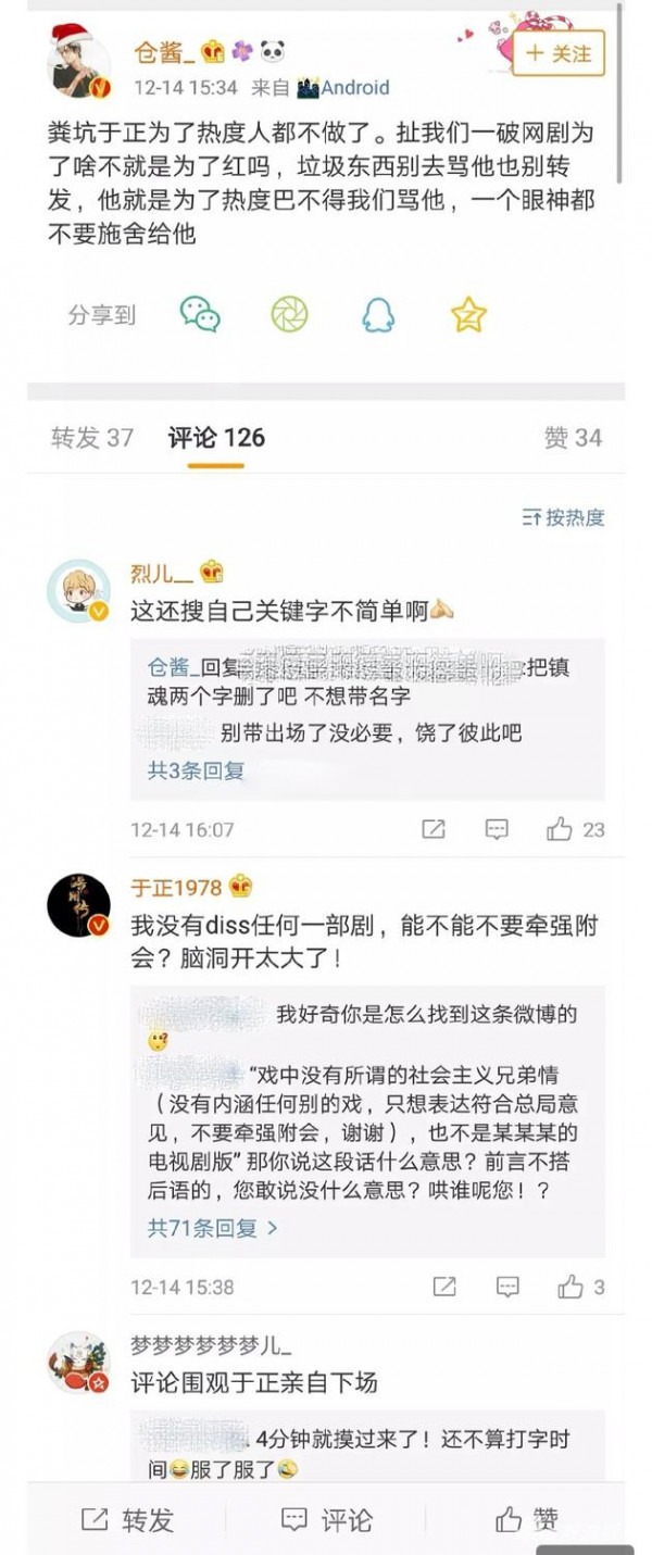 近日,于正和电视剧《镇魂》的粉丝闹上了不愉快。于正在微博上分享了他的新剧《鬓边不是海棠红》的多张道具照片及开机照,在配文中提到一句“戏中没有所谓的社会主义兄弟情”,这句话引起了《镇魂》粉丝的不满。网友质疑于正发这个话是为了让自己的新剧蹭《镇魂》的热度,用词激烈,随后于正亲自在下面评论,回应道“我没有diss任何一部剧,能不能不要牵强附会?”