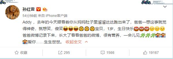12月16日,孙红雷发文为女儿庆祝一周岁生日。他写道:“Addy ,去年的今天眼看着你从妈妈肚子里溜溜达达跑出来了,爸爸一想这事就觉得神奇,就想笑,傻笑!”“宝贝,