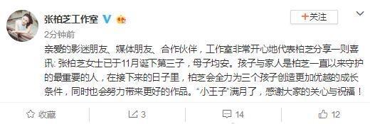 12月17日,张柏芝工作室在微博发文,宣布了张柏芝生下三胎的喜讯。正文称:“张柏芝女士已于11月诞下第三子,母子均安。”工作室还表示:“‘小王子’满月了,感谢大家的关心与祝福!”恭喜!
