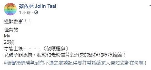 依照12月初公告的计划表,《怪美》MV原定在21日就要上线,谁料蔡依林突然在18日深夜发出“道歉启事”,无奈宣布MV会延期公开,而且一延就是五天:“怪美的MV 26号才能上线……女骗子愿承担,脱粉和老粉雪片般飞来的鄙视和哼哼蛤蛤!”
